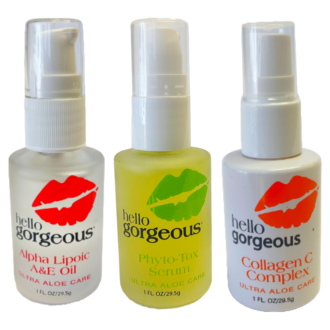 These three anti-aging serums smooth out wrinkles under and around the eyes, increase your collagen-elastin network, plump up dehydrated skin, reduces the depth of wrinkles and so much more.  Along with our famous 200% Aloe Vera base choked full of over 200 phyto nutrients this trio will keep you looking younger longer.